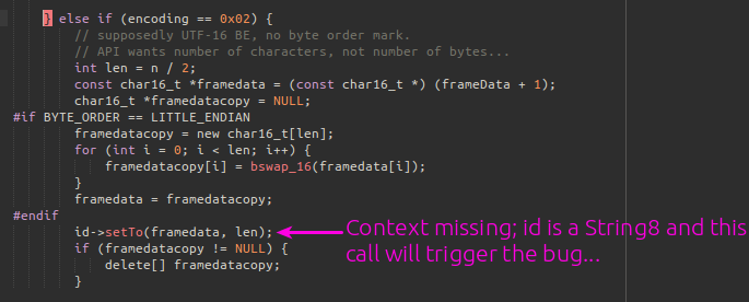 A very simple file; just enough to get an ID3 tag read and processed that will trigger a large overflow out of a very small allocation. I’ve highlighted the first instance of the bad UTF16 sequence that will trigger the overflow; this sequence is just repeated many many times.