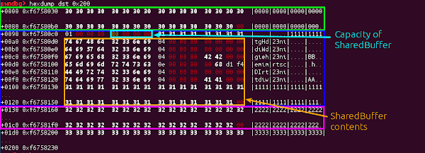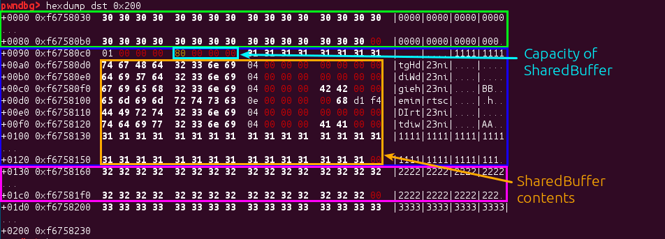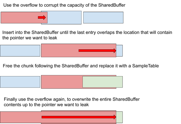 Allocating a SampleTable after the corrupted SharedBuffer will give us the following: