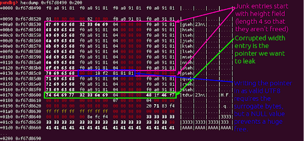 This value will then be handed back to Chrome as the height of the video, and we can read it back from javascript. This is a powerful primitive; and we’ll use this multiple times in the final exploit. First though, we just need to load this file repeatedly until we get an address that we can safely encode using UTF8; we’ll need a valid address that we can write using the overflow for the next step.