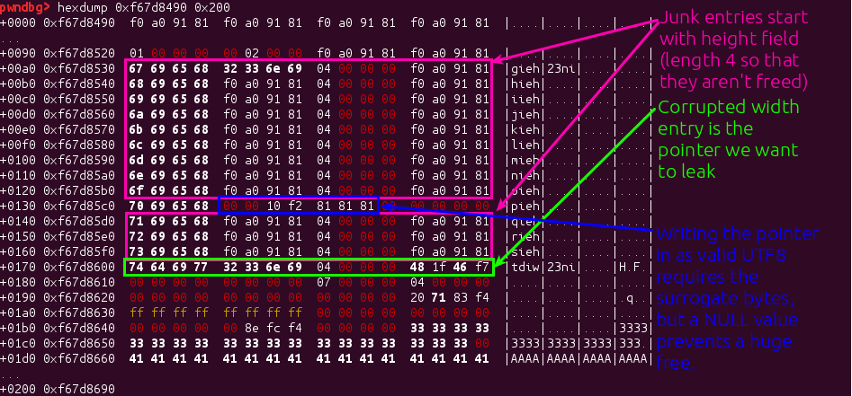 This gives quite a nice exploitation primitive; by creating a string containing valid UTF16, we can control the size of the allocation; and we control the size of the overflow, with the limitation that it must be a multiple of 4 bytes larger than the allocation. The only significant limitation is that the data that we overflow with needs to be valid UTF8, which will prove slightly annoying later on.