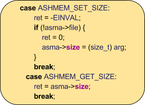 Let’s take a closer look at the actual implementation of the ashmem device, starting with the ioctl used to control the size of a shared memory region - ASHMEM_SET_SIZE: