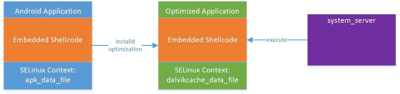 The distinction, however, is purely semantic. This is due to the fact that system_server can directly issue commands to installd using a special socket. One such command can be issued to cause installd to start such an optimization process (resulting in a file with the dalvikcache_data_file context) from any chosen file and to any chosen destination. Thus, all our ROP chain would need to do is to open the installd socket, issue this command to create our wanted executable chunk, and finally map that new file as executable.