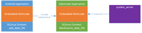 We could even go one step further - since we are launching our attack from an Android application, we could simply embed the executable shellcode within the source code of our application (for example, within a static byte array). Once our application is installed, it will be optimized, resulting in a new file of type dalvikcache_data_file). As luck would have it, this optimization process does not garble static byte arrays, meaning our shellcode will now reside in this new executable file. Finally, all we need to do is to simply locate this optimised file on the disk and map it in as executable.