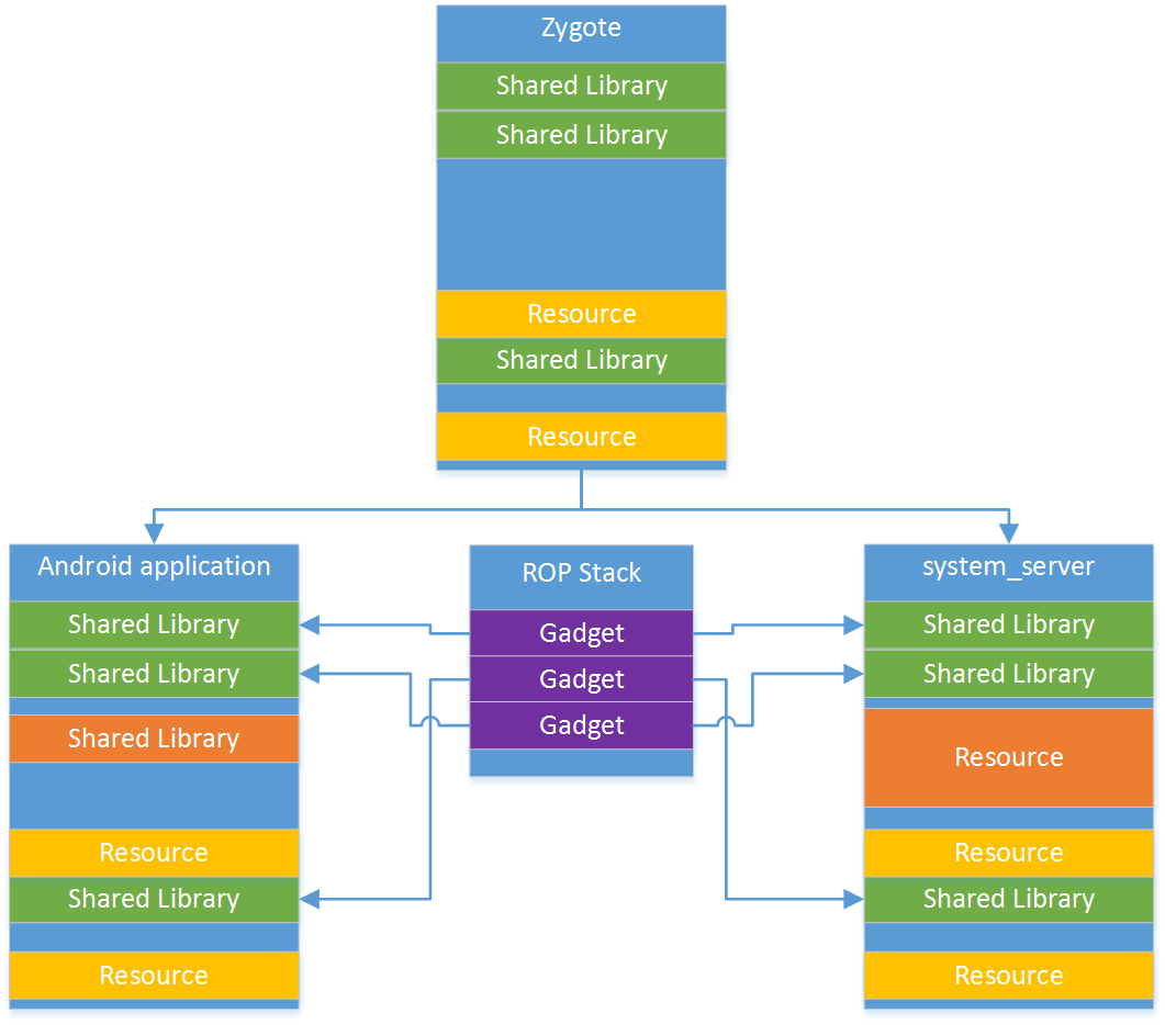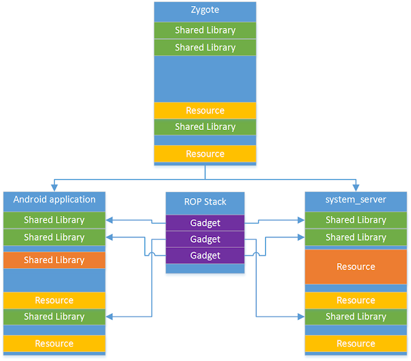 - Build a ROP stack using gadgets in zygote-originating shared libraries