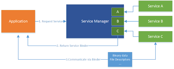 As you know, Android applications can perform inter-process communication (for example, in order to communicate with various Android services), by using the Android binder. Initially, each Android service registers itself with a central daemon; the “service manager”. Subsequently, applications may contact the daemon in order to request “handles” with which the registered services may be contacted.