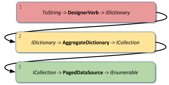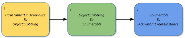 With our enumerable list we can get the assembly loaded and our own code executed, but how do we get the list enumerated to start the chain? For this decided I’d try and find a class which when calling ToString (a pretty common method) would enumerate the list. This is easy in Java, almost all the collection classes have this exact behavior. Sadly it seems .NET doesn't follow Java in this respect. So I modified my analysis tools to try and hunt for gadgets which would get us there. To cut a long story short I found a chain from ToString to IEnumerable through three separate classes. The chain looks something like the following: