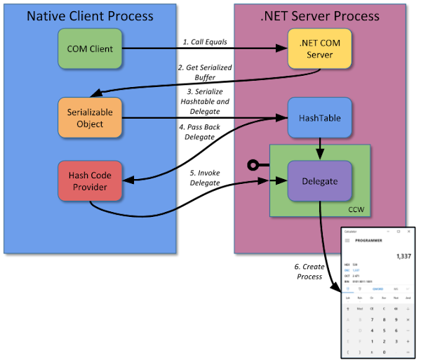 The second issue was more subtle and is a byproduct of a feature of .NET interop which presumably no-one realized would be a security liability. Loading the .NET runtime requires quite a lot of additional resources, therefore the default for a native COM client calling methods on a .NET COM server is to let COM and the CCW manage the communication, even if this is a performance hit. Microsoft could have chosen to use the COM marshaler to force .NET to be loaded in the client but this seems overzealous, not even counting the possibility that the client might not even have a compatible version of .NET installed.