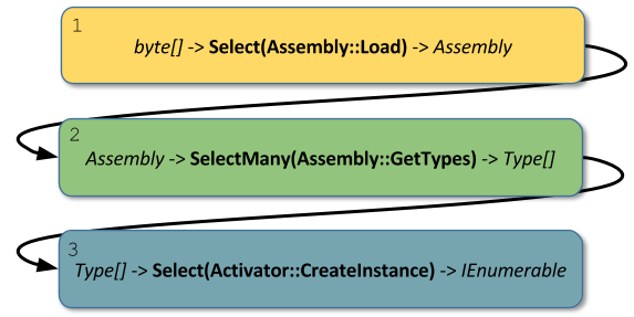 The only tricky part is step 2, we’d like to extract a specific type but our only real option is to use the Enumerable.Join method which requires some weird kludges to get it to work. A better option would have been to use Enumerable.Zip but that was only introduced in .NET 4. So instead we’ll just get all the types in the loaded assembly and create them all, if we just have one type then this isn’t going to make any difference. How does the implementation look in C#?