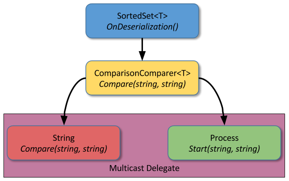 The only weird thing about this code is TypeConfuseDelegate. It’s a long standing issue that .NET delegates don’t always enforce their type signature, especially the return value. In this case we create a two entry multicast delegate (a delegate which will run multiple single delegates sequentially), setting one delegate to String::Compare which returns an int, and another to Process::Start which returns an instance of the Process class. This works, even when deserialized and invokes the two separate methods. It will then return the created process object as an integer, which just means it will return the pointer to the instance of the process object. So we end up with chain which looks like the following: