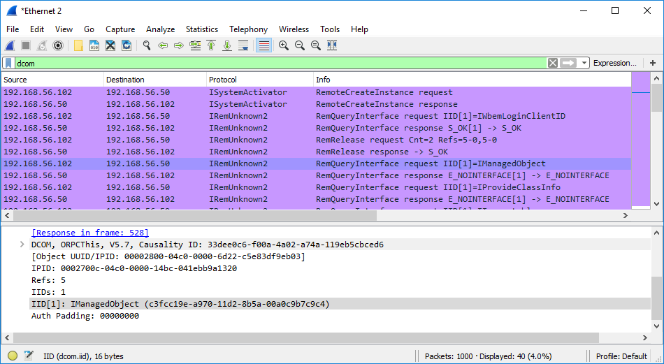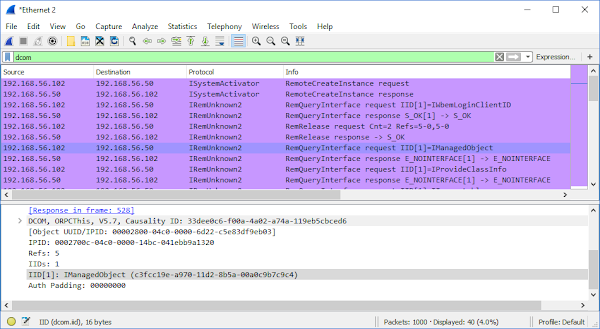 At this point we could jump straight into RE of the .NET and PS class libraries, but there’s an easier way. It’s likely we’d be able to see whether the .NET client queries for IManagedObject by observing the DCOM RPC traffic to a WMI server. Wireshark already has a DCOM dissector saving us a lot of trouble. For a test I set up two VMs, one with Windows Server 2016 acting as a domain controller and one with Windows 10 as a client on the domain. Then from a Domain Administrator on the client I issued a simple WMI PS command ‘Get-WmiObject Win32_Process -ComputerName dc.network.local’ while monitoring the network using Wireshark. The following image shows what I observed: