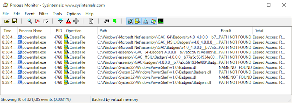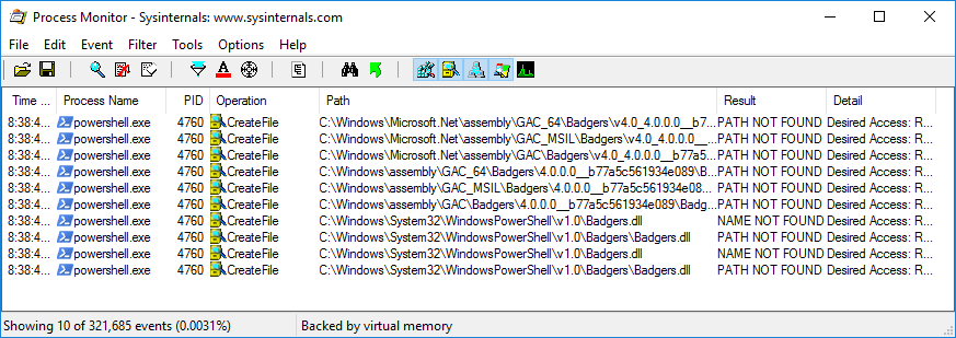 If we successfully injected a serialized stream then we’d expect the PS process to try and lookup a Badgers.dll file and using Process Monitor that’s exactly what we find.