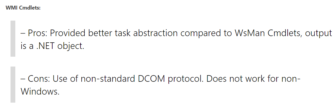 Looking at MSDN, .NET supports WMI through the System.Management namespace. This has existed since the beginning of .NET. It supports remote access to WMI and considering the age of the classes it predates WSMAN and so almost certainly uses DCOM under the hood. On the PS front there’s support for WMI through cmdlets such as Get-WmiObject. PS version 3 (introduced in Windows 8 and Server 2008) added a new set of cmdlets including Get-CimInstance. Reading the related link it’s clear why the CIM cmdlets were introduced, support for WSMAN, and the link explicitly points out that the “old” WMI cmdlets uses DCOM.