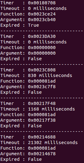 We can see that the timer list is ordered by the timeout value, and most of the timers have a relatively short timeout. Moreover, all the timers are allocated during the firmware’s initialisation, and are therefore stored at constant addresses. This is important since, if we’d like to target our free chunk at a timer, we’d need to know it’s exact location in memory.