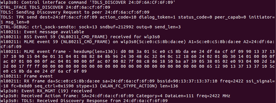 Indeed, after compiling wpa_supplicant with TDLS support (CONFIG_TDLS), setting up a network, and connecting our target device and our research platform to the network, we can see that issuing the TDLS_DISCOVER command works - we can indeed identify our peer.