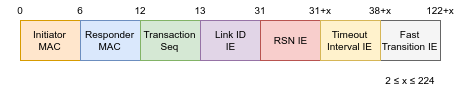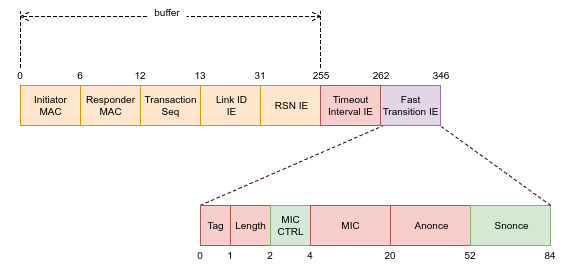 For example, the Timeout Interval IE is verified prior to the MIC’s calculation and only has a constrained set of allowed values, making it uncontrollable. Similarly, the FTIE’s tag and length fields are constant, and therefore not controllable. Lastly, the 32-byte “Anonce” value is randomly chosen by the TDLS responder, placing it firmly out of our field of influence.
