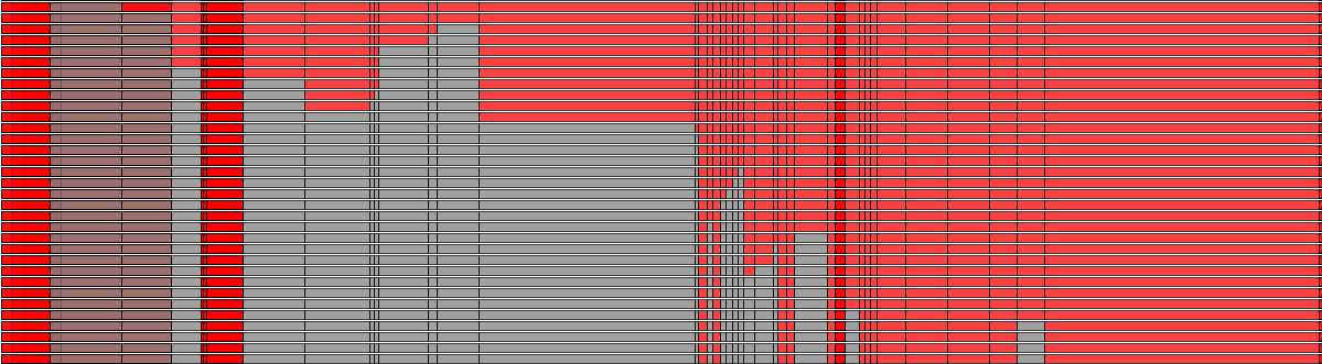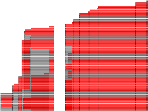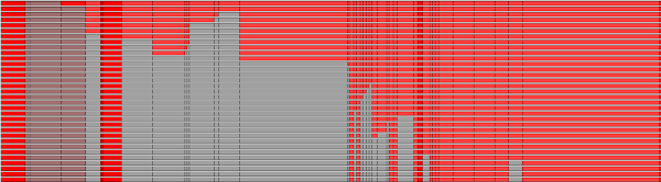 The vertical axis denotes time - each line is a new heap state after a malloc or free operation. The horizontal axis denotes space - lower addresses are on the left, while higher addresses are on the right. Red blocks indicate chunks that are in-use, grey blocks indicate free chunks.