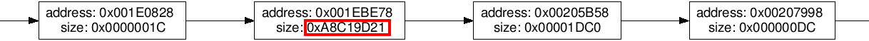 Ah-ha! Indeed one of the chunks in the freelist suddenly has an exceptionally large size after tearing down the connection. Recall that since the allocator uses “best-fit”, this means that subsequent allocations won’t be placed in this block as long as other large enough free chunks exist. This also means that the firmware did not crash, and in fact continued to function correctly. Had we not visualised the state of the heap, we wouldn’t have been able to determine anything had happened at all.