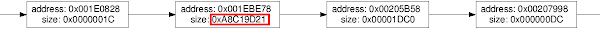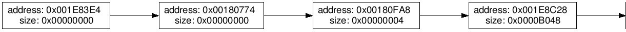 After writing a small visualiser script which walks over the heap’s freelist and exports the its contents into dot, we can plot the state of the freelist using graphviz, like so: