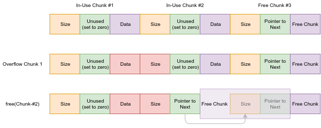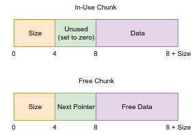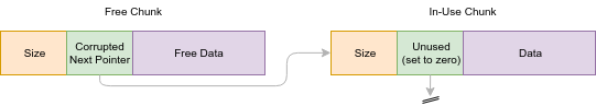 Recall that in-use chunks specify their size field at the same location free chunks do theirs. As for the “next” pointer, it is unused in free chunks, but is set to zero during the allocation of the chunk. This means that by corrupting the free list to point at an in-use chunk, we can trick the heap into thinking it’s just another free chunk, which is coincidentally also the last chunk in the freelist. That’s comfortable.