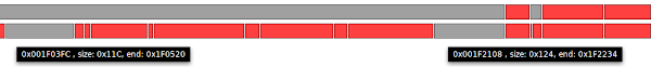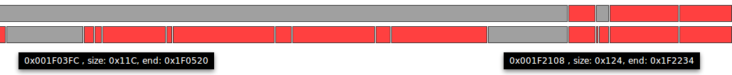 By reverse-engineering the allocator’s implementation, we can also find the location of the pointer to the head of the first free-chunk in RAM. Combining these two facts together, we can create a utility which, given a dump of the firmware’s RAM, can plot the current state of the heap’s freelist. Acquiring a snapshot of the firmware’s RAM can be easily achieved by using dhdutil’s “upload” command.