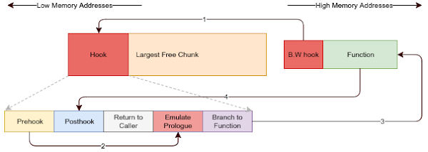 First, we’ll need to write a “patcher”, which will allow us to insert hooks on given RAM-resident functions. It’s important to note that both the malloc and free functions are both present in RAM (they are among the first functions in the RAM’s code chunk). This allows us to freely re-write their prologues in order to introduce a branch to our own code. I’ve written a patcher which performs insertion of such hooks, allowing execution of small assembly stubs before and after the invocation of the hooked function.