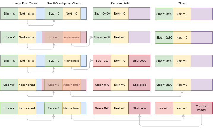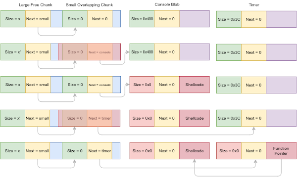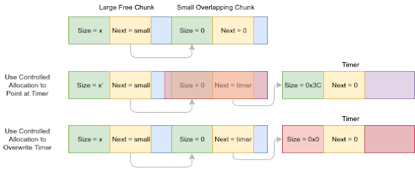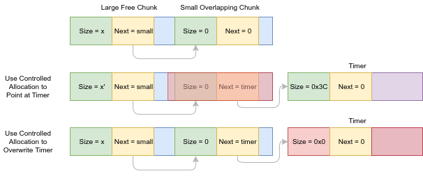 Here’s the game plan. First, we’ll use the techniques described above to create two overlapping free chunks. Now, we can use the controlled allocation primitive to point the smaller free chunk at one of the timers in the list above. Next, we create another controlled allocation (freeing the old one). This one will be of size 0x3C, for which the timer chunk is the best-fitting. Therefore, at this point, we’ll overwrite the timer’s contents.