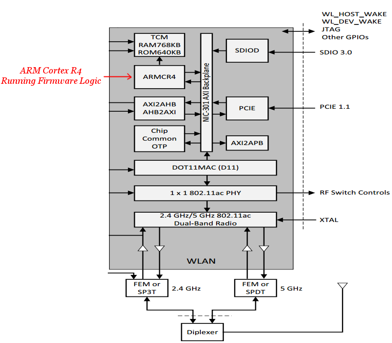 To start off our research, we’ll need to find some way to explore the Wi-Fi chip. Luckily, Cypress has recently acquired Broadcom’s Wireless IOT business, and have published many of the datasheets related to Broadcom’s Wi-Fi chipsets (albeit for a slightly older SoC, the BCM4339). Reading through the datasheet, we gain some insight into the hardware architecture behind the Wi-Fi chipset.