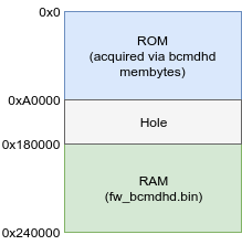 So what about the ROM’s contents? One way to extract the ROM would be to use the host driver’s chip memory access capabilities (via PIO over SDIO or PCIe) to read the ROM’s contents directly. However, doing so would require modifying the driver to enable us to issue the commands needed to dump the ROM. Another way to retrieve the ROM would be to load our own modified firmware file into RAM, into which we’ll insert a small stub that can be used to dump the ROM’s memory range. Luckily, none of these approaches is actually needed in this case; Broadcom provides an extremely powerful command-line utility called dhdutil, which can be used to interact with the chip via the bcmdhd driver.