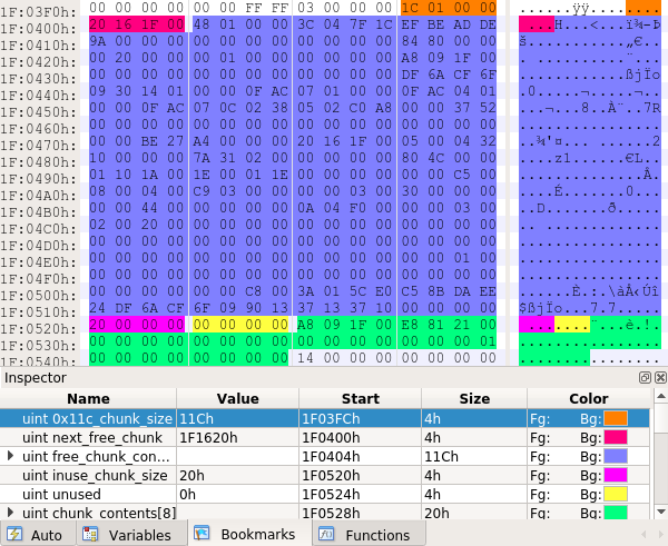 Let’s take a closer look at the next in-use chunk and see whether there’s any interesting information that we’d like to overwrite there: