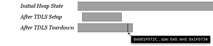 As we can clearly see above, establishing a TDLS connection is a messy operation. There are many allocations and deallocations, for regions both large and small. This abundance of noise doesn’t bode well for us. Recall that the overflow during the setup stage is highly constrained, both in terms of the data being written, and in terms of the extent of the overflowing data. Moreover, the overflow occurs during one of the many allocations in the setup phase. This doesn’t allow us much control over the state of the heap prior to triggering the overflow.