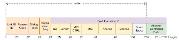 Two of the vulnerabilities can be triggered when connecting to networks supporting wireless roaming features; 802.11r Fast BSS Transition (FT), or Cisco’s CCKM roaming. On the one side, these vulnerabilities should be relatively straightforward to exploit - they are simple stack overflows. Moreover, the operating system running on the firmware (HNDRTE) does not use stack cookies, so there’s no additional information leak or bypass required.