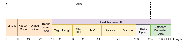 Ah-ha, so once again a straightforward overflow; the FT-IE’s length field is not verified to ensure that it doesn’t exceed the length of the allocated buffer. This means that simply by providing a crafted FT-IE, we can trigger the overflow. Nevertheless, once again there are several verifications prior to triggering the vulnerable code path which limit our control on the overflowing elements. Let’s try and plot the placement of elements during the overflow: