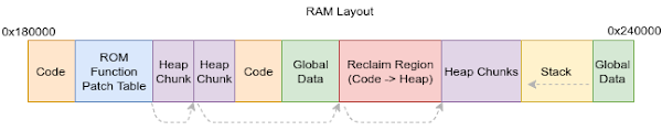 However, this is still not quite enough... Remember that the RAM has to accommodate the heap, stack and global data structures, as well as all the patches or modifications to ROM functions. Quite a tall order for a measly 768KB. To get around this, Broadcom has decided to place all the functions that are only used during the firmware’s initialisation in two special regions. Once the initialisation is completed, these regions are “reclaimed”, and are thereafter converted into heap chunks.