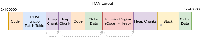 What’s more, heap chunks are interspersed between code and data structures in RAM - since the latter sometimes have alignment requirements (or are referenced directly from ROM, so they cannot be moved). The end result is that RAM is a jumbled mess of heap chunks, code and data structures.