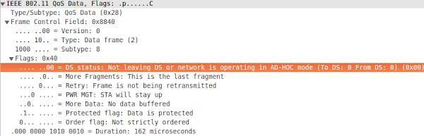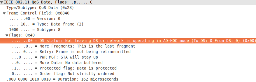 Let’s start by familiarising ourselves with the structure of TDLS frames. As you may know, 802.11 frames use the “flags” field in order to indicate the “direction” in which a frame is travelling (from the client to the AP, AP to client, etc.). TDLS traffic co-opts the use of the flag values indicating traffic in an Ad-Hoc (IBSS) network (To-DS=0, From-DS=0).