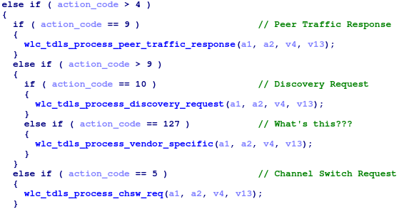 To search for one, let’s start by looking at the function handling each of the TDLS action frames - wlc_tdls_rcv_action_frame. The function starts by reading out the TDLS category and action code. Then, it routes the frame to the appropriate handler function, according to the received action code: