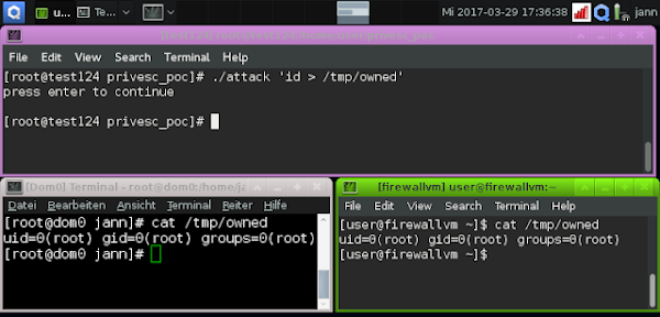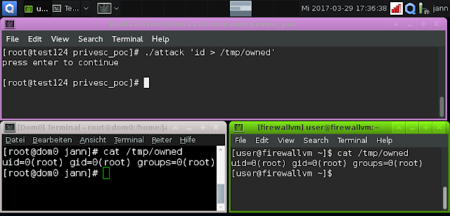 Here is a screenshot of a successful attack against Qubes OS 3.2, which uses Xen as its hypervisor. The exploit is executed in the unprivileged domain "test124"; the screenshot shows that it injects code into dom0 and the firewallvm: