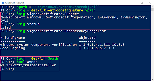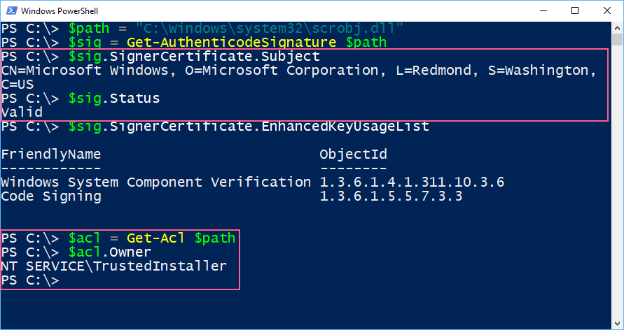 Criteria 1 and 2 are easy to meet, any Microsoft COM object on the system is signed by a trusted certificate (one of Microsoft’s publisher certificates) and is almost certainly owned by TrustedInstaller. However, criteria 3 would seem much more difficult to meet, a COM object is usually implemented inside the DLL and we can’t modify the DLL itself, otherwise it would no longer be signed. It just so happens that there is a Microsoft signed COM object installed by default which will allow us to meet criteria 3, Windows Script Components (WSC).