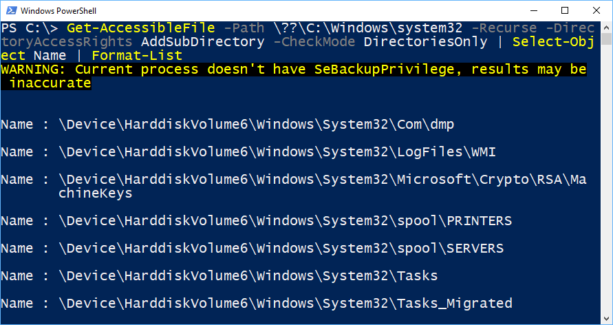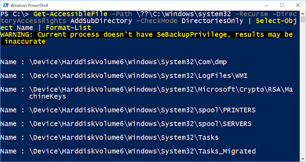 The main check for the Owner is in supHardenedWinVerifyImageByLdrMod. Almost the first thing that function does is call supHardNtViCheckIsOwnedByTrustedInstallerOrSimilar which we saw earlier. However as the comments above the check indicate the code will also allow files under System32 and WinSxS directories to not be owned by TrustedInstaller. This is a bus sized hole in the point of the check, as all we need is one writeable directory under System32. We can find some by running the Get-AccessibleFile cmdlet in my NtObjectManager PS module.