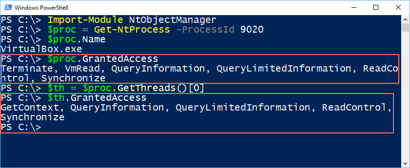 We can verify this access limitation by opening the VirtualBox process and one of its threads and see what access rights we’re granted. For example the following picture highlights the process and thread granted access.