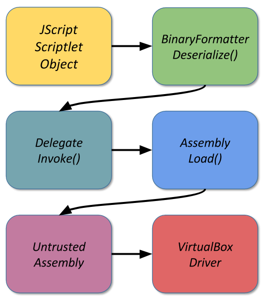 In the end I chose to deserialize a Delegate object which when executed by the script engine would load an Assembly from memory and return the Assembly instance. The script engine could then instantiate an instance of a Type in that Assembly and run arbitrary code. It does sound simple in principle, in reality there are a number of caveats. Rather than bog down this blog post with more detail than necessary the tool I used to generate the Scriptlet file, DotNetToJScript is available so you can read how it works yourself. Also the PoC is available on the issue tracker here. The chain from the JScript component to being able to call the VBOX driver looks something like the following: