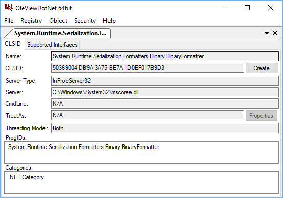 Where do we even start on achieving this goal? From a previous blog post it’s possible to expose .NET objects as COM objects through registration and by abusing Binary Serialization we can load arbitrary code from a byte array. Many core .NET runtime classes are automatically registered as COM objects which can be loaded and manipulated by a scripting engine. The big question can now be asked, is BinaryFormatter exposed as a COM object?
