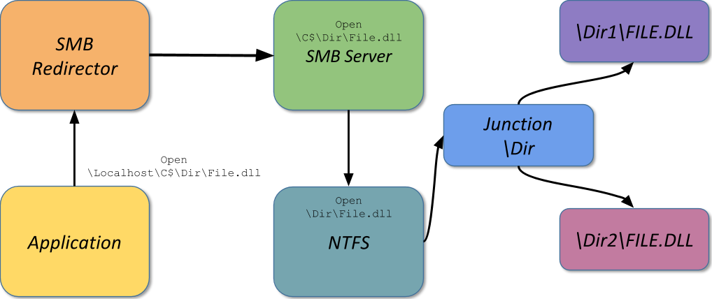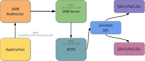 Having a remote server isn’t ideal, however we can do everything we need by using the local loopback SMB server and access files via the admin shares. Contrary to their names admin shares are not limited to administrators if you’re coming from localhost. The key to getting this to work is to use a Directory Junction. Junctions are resolved on the server, the redirector client knows nothing about them. Therefore as far as the client is concerned if it opens the file \\localhost\c$\Dir\File.dll once, then reopens the same file these could be two completely different files as shown in the following diagram: