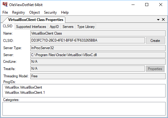 If you run Process Monitor against the protected VBOX process you’ll notice that it uses COM, specifically it uses the VirtualBoxClient class which is implemented in the VBoxC.dll COM server.