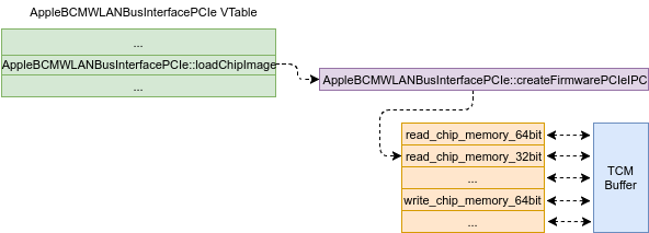 We’ll revisit the two drivers more in-depth later on, but for now it’s sufficient to say that we have a relatively good idea where to start looking for a potential TCM mapping -- after all, as we’ve seen, the TCM access is performed by mapping the PCIe BARs. Therefore, it would stand to reason that such an operation would be performed by AppleBCMWLANBusInterfacePCIe.