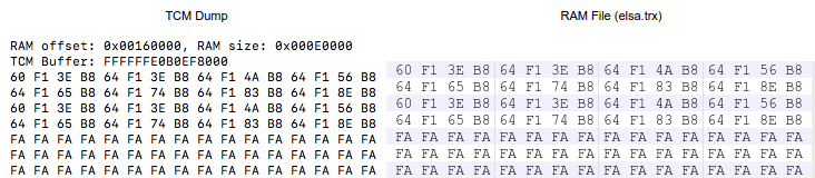Since the TCM mapping provides a view into the Wi-Fi chip’s RAM, we’d naturally expect it to begin with the same values as those we had identified in the RAM file extracted from the firmware. Let’s try and read out some of the values from the buffer and see whether it matches the RAM dump: