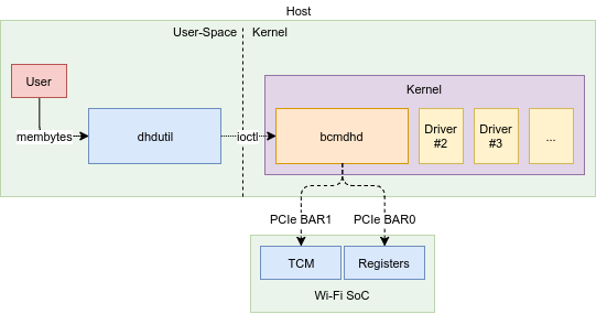 To answer this question, let’s trace our way through the Android components involved in the control flow for accessing the Wi-Fi chip’s memory from the host. The flow begins with a user issuing a memory access command via Broadcom’s debugging utility (“membytes”). This, in turn, triggers an ioctl to Broadcom’s driver, requesting the memory access operation. After some processing within the driver, it performs the requested action by directly accessing the chip’s tightly-coupled memory (TCM) from the kernel’s Virtual Address-Space (VAS).
