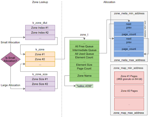 After spending some time familiarising ourselves with kalloc’s implementation, we can sketch a high-level view of the allocator’s implementation. Since kalloc is a “zone allocator”, each allocated object is assigned a region from which it is drawn. Individual regions are represented by the zone_t structure, which holds all of the metadata pertaining to the zone.