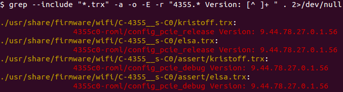 Since the RAM blob is loaded into the Wi-Fi chip during its initialisation by the host, it should be accessible via the host’s root filesystem. Indeed, after downloading the iPhone’s firmware image, extracting the root filesystem and searching for indicative strings, we are greeted with the following result: